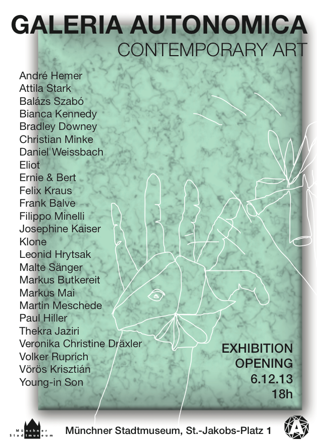 Artists: André Hemer, Attila Stark, Balázs Szabó, Bianca Kennedy, Brad Downey, Christian Minke, Daniel Weissbach, Eliot, Ernie & Bert, Felix Kraus, Frank Balve, Filippo Minelli, Josephine Kaiser, Klone, Leonid, Hrytsak, Malte Sänger, Markus Butkereit, Markus Mai, Martin Meschede, Paul Hiller, Thekra Jaziri, Veronika Christine Dräxler, Volker Ruprich, Vörös Krisztián, Young-in Son